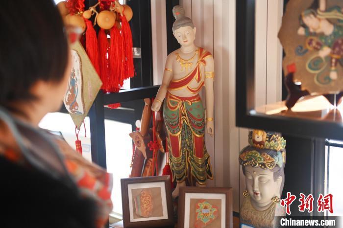 2月8日,甘肅省蘭州市城關(guān)區(qū)“非遺年貨購物月”活動現(xiàn)場,游人挑選敦煌系列文創(chuàng)產(chǎn)品。中新社記者 李亞龍 攝