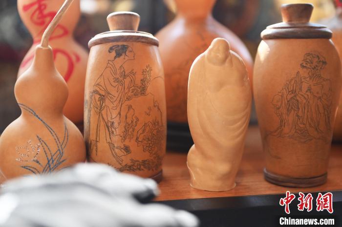 2月8日,甘肅省蘭州市城關(guān)區(qū)“非遺年貨購物月”活動現(xiàn)場展出的刻葫蘆文創(chuàng)產(chǎn)品。 中新社記者 李亞龍 攝