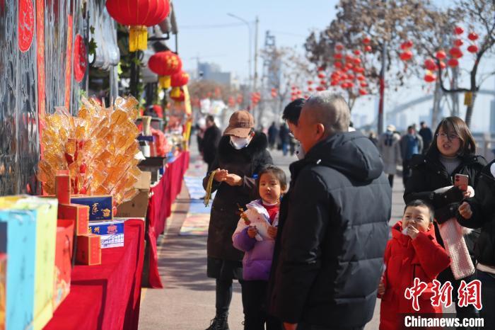 2月8日,甘肅省蘭州市城關(guān)區(qū)“非遺年貨購物月”活動現(xiàn)場,游人購買蘭州三炮臺、糖畫等傳統(tǒng)美食。 中新社記者 李亞龍 攝