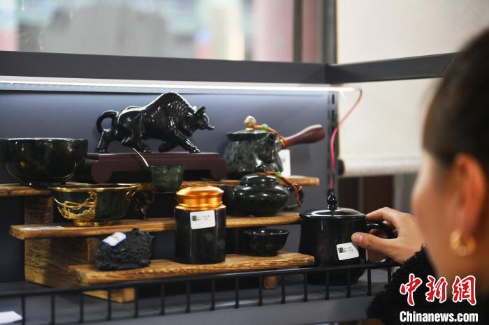2月8日,甘肅省蘭州市城關(guān)區(qū)“非遺年貨購物月”活動現(xiàn)場,游人挑選武山鴛鴦玉夜光杯茶具。中新社記者 李亞龍 攝