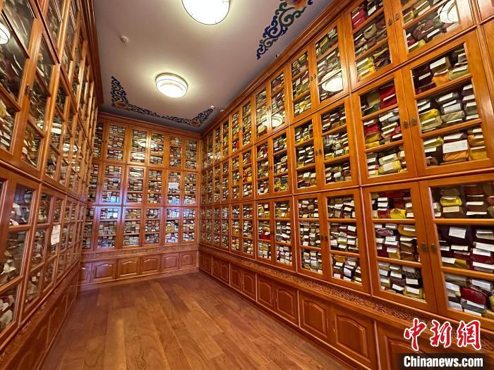 2月28日,修繕后的拉卜楞寺藏經(jīng)樓內(nèi),所藏古籍文獻整齊擺放于新書架上。中新社記者 丁思 攝