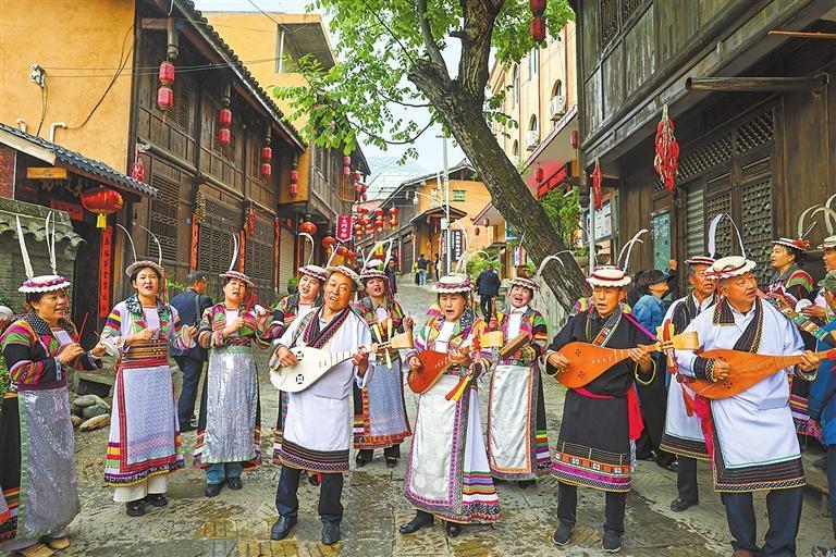 在文縣鐵樓藏族鄉(xiāng)草河壩村白馬山寨,土琵琶彈唱表演吸引游客駐足觀賞。新甘肅·甘肅日報記者 馮樂凱