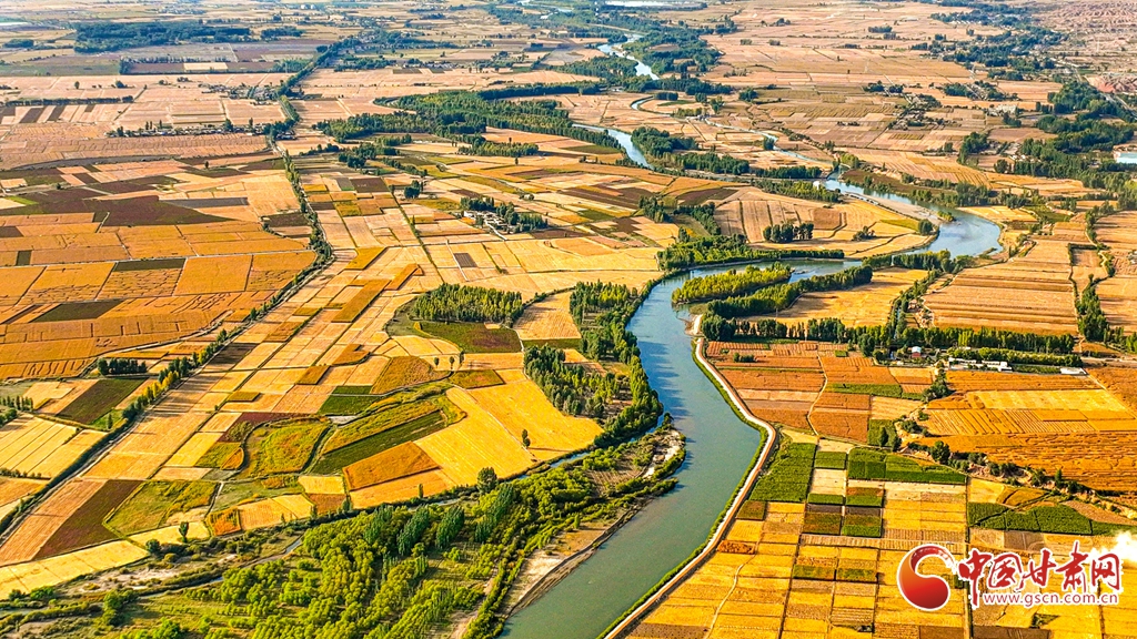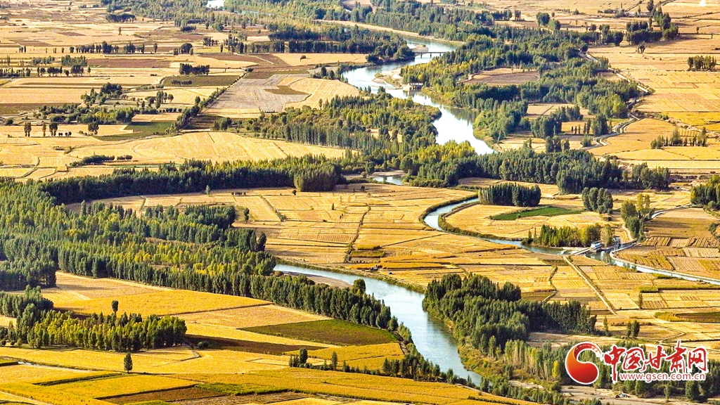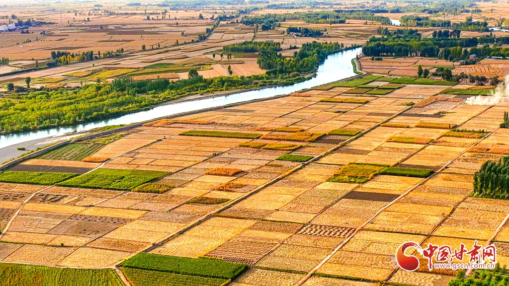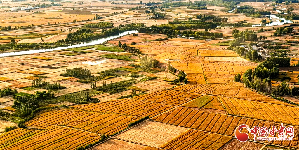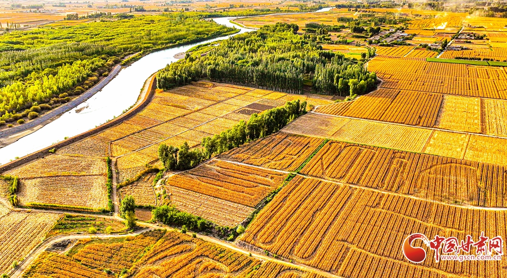 9月26日傍晚,夕陽映照下的黑河張掖臨澤縣鴨暖鎮(zhèn)段,蜿蜒流淌的河水與兩岸鋪滿金色的大地交相輝映,盡顯盎然生機(jī),共同勾勒出一幅金秋豐收的壯美畫卷。