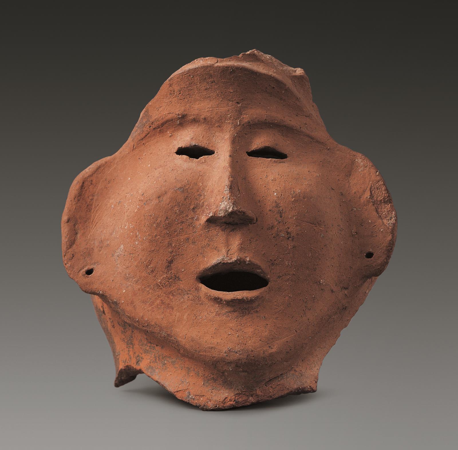 仰韶文化石嶺下類型(距今5200年前)天水市柴家坪出土殘高15.3厘米,寬14.6厘米。人像高顴闊面,眉稍隆起,嘴、眼鏤空成橫條狀,鼻呈三角形,兩耳垂各有一穿孔。