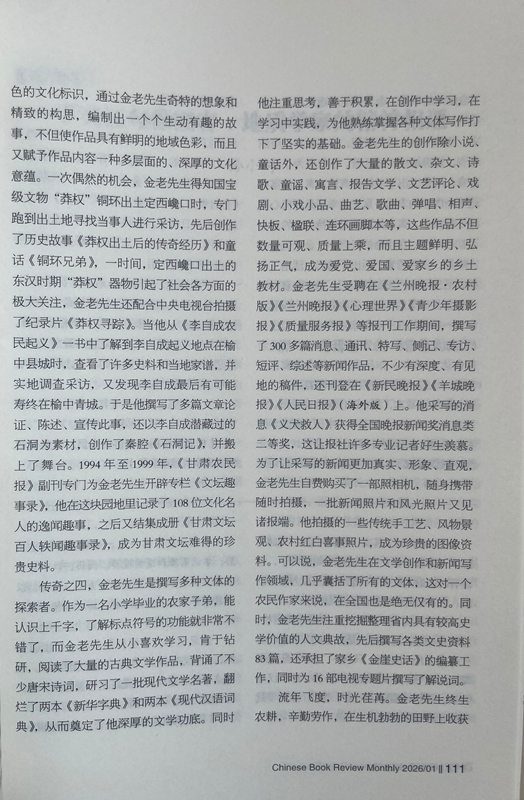傳奇之四,金老先生是撰寫多種文體的探索者。作為一名小學(xué)畢業(yè)的農(nóng)家子弟,能認(rèn)識上千字,了解標(biāo)點符號的功能就非常不錯了,而金老先生從小喜歡學(xué)習(xí),肯于鉆研,閱讀了大量的古典文學(xué)作品,背誦了不少唐宋詩詞,研習(xí)了一批現(xiàn)代文學(xué)名著,翻爛了兩本《新華字典》和兩本《現(xiàn)代漢語詞典》,從而奠定了他深厚的文學(xué)功底。同時他注重思考,善于積累,在創(chuàng)作中學(xué)習(xí),在學(xué)習(xí)中實踐,為他熟練掌握各種文體寫作打下了堅實的基礎(chǔ)。金老先生的創(chuàng)作除小說、童話外,還創(chuàng)作了大量的散文、雜文、詩歌、童謠、寓言、報告文學(xué)、文藝評論、戲劇、小戲小品、曲藝、歌曲、彈唱、相聲、快板、楹聯(lián)、連環(huán)畫腳本等,這些作品不但數(shù)量可觀、質(zhì)量上乘,而且主題鮮明、弘揚正氣,成為愛黨、愛國、愛家鄉(xiāng)的鄉(xiāng)土教材。金老先生受聘在《蘭州晚報·農(nóng)村版》《蘭州晚報》《心理世界》《青少年攝影報》《質(zhì)量服務(wù)報》等報刊工作期間,撰寫了300多篇消息、通訊、特寫、側(cè)記、專訪、短評、綜述等新聞作品,不少有深度、有見地的稿件,還刊登在《新民晚報》《羊城晚報》《人民日報》(海外版)上。他采寫的消息《義犬救人》獲得全國晚報新聞獎消息類二等獎,這讓報社許多專業(yè)記者好生羨慕。為了讓采寫的新聞更加真實、形象、直觀,金老先生自費購買了一部照相機(jī),隨身攜帶隨時拍攝,一批新聞?wù)掌惋L(fēng)光照片又見諸報端。他拍攝的一些傳統(tǒng)手工藝、風(fēng)物景觀、農(nóng)村紅白喜事照片,成為珍貴的圖像資料。可以說,金老先生在文學(xué)創(chuàng)作和新聞寫作領(lǐng)域,幾乎囊括了所有的文體,這對一個農(nóng)民作家來說,在全國也是絕無僅有的。同時,金老先生注重挖掘整理省內(nèi)具有較高史學(xué)價值的人文典故,先后撰寫各類文史資料83篇,還承擔(dān)了家鄉(xiāng)《金崖史話》的編纂工作,同時為16部電視專題片撰寫了解說詞。