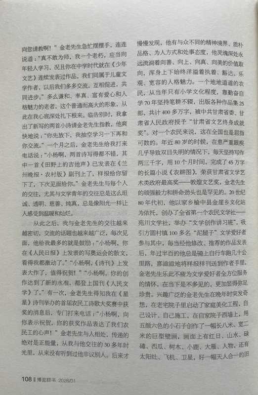 從此之后,我與金老先生的交往越來越密切,交流的話題也越來越廣泛,每次見面,他給我最多的就是鼓勵:“小楊啊,你在《人民日報》上發(fā)表的寫奧運會的散文,看得我都激動了。”“小楊啊,《詩刊》上發(fā)表大作了,值得祝賀!”“小楊啊,你的創(chuàng)作達(dá)到了新的水準(zhǔn),都登上國刊《人民文學(xué)》了。”有一次,金老先生得知我在《星星》詩刊舉辦的首屆農(nóng)民工詩歌大獎賽中獲獎的消息后,專門打來電話:“小楊啊,向你表示祝賀,你的獲獎作品表達(dá)了我們農(nóng)民工的心聲!”金老先生與人相處,傳遞的絕對是正能量,從我與他交往的30多年時光里,從來沒有聽到過他非議別人。后來才慢慢發(fā)現(xiàn),他有與眾不同的精神境界、質(zhì)樸品格、為人方式和處事態(tài)度,他靈魂深處永遠(yuǎn)流淌著向善、向上、向真、向美的價值取向,渾身上下始終洋溢著執(zhí)著、豁達(dá)、樂觀、寬容的人格魅力。一個地地道道的農(nóng)民,從當(dāng)年只有小學(xué)文化程度,靠勤奮自學(xué)70年堅持筆耕不輟,出版各種作品集25部,共計400多萬字,被中共甘肅省委、甘肅省人民政府授予“甘肅省文藝終身成就獎”。對一個農(nóng)民來說,這在全國也是屈指可數(shù)的。年近80歲的時候,在患嚴(yán)重眼疾幾乎導(dǎo)致雙目失明的情況下,每天堅持寫作兩三千字,用10個月時間,完成了45萬字的長篇小說《農(nóng)耕圖》,榮獲甘肅省文學(xué)藝術(shù)類政府最高獎——敦煌文藝獎,金老先生的頑強(qiáng)毅力和拼命勁頭也是罕見的。20世紀(jì)80年代初,他以家鄉(xiāng)榆中縣金崖鄉(xiāng)文化站為依托,創(chuàng)辦了全省第一個農(nóng)民文學(xué)社——苑川文學(xué)社,舉辦“文學(xué)創(chuàng)作講習(xí)班”,吸引方圓村鎮(zhèn)100多名“泥腿子”文學(xué)愛好者參與其中,每當(dāng)經(jīng)他修改、推薦的作品發(fā)表后,年過半百的他總是騎上自行車跑幾十公里路,喜滋滋地將樣報樣刊送到作者手里,金老先生樂此不疲為文學(xué)愛好者全方位服務(wù)的情懷,在當(dāng)下是不多見的,更加顯得彌足珍貴。興趣廣泛的金老先生在晚年時突發(fā)奇想,在老宅院子里啟動了家庭美化工程,自己設(shè)計、自己施工,在自家院子西墻上,用五顏六色的小石子創(chuàng)作了一幅長八米、寬二米的巨型壁畫,畫面上有紅日、山水、碌碡、西瓜、樹木、小鹿、大雁、人物,還有太陽灶、飛機(jī)、衛(wèi)星,好一幅天人合一的田園風(fēng)光畫。站在壁畫面前,讓人遐想萬千、拍手叫絕,這一獨具特色的創(chuàng)舉,完全表達(dá)了金老先生所渴望的理想王國和精神家園。2014年4月,金老先生家庭被國家廣播電視總局授予首屆全國“書香之家”稱號。進(jìn)入耄耋之年的金老先生,創(chuàng)作激情依然旺盛,他又癡迷于劇本創(chuàng)作,先后創(chuàng)編了大型劇目4部,小戲小品曲藝46個。他不僅要創(chuàng)作劇本,而且還要想方設(shè)法搬上舞臺。為此他東奔西跑,甚至還要自掏腰包,千方百計尋找業(yè)余劇團(tuán),想盡辦法爭取高水平、低成本演出。雁過留聲,腳踏留痕,鄉(xiāng)村廣場、學(xué)校操場、打麥場上都留下了他帶隊演出的閃光足跡和百姓的歡歌笑語。興致高時,金老先生還上臺扮演一個角色,過足他愛戲唱戲的癮,完全和大家心連心、共歡樂。晚年的他最喜歡表演自編自導(dǎo)的古劇種“扁擔(dān)戲”,除了在村上幼兒園演出外,大多在自家的院子里演出,有時觀眾只有他老伴和孫女,還有一條忠實的小狗。金老先生用這種獨特的方式,表達(dá)對民族優(yōu)秀傳統(tǒng)文化的敬畏和弘揚,也讓我們感受到一位真正熱愛生活的作家,一定是牢牢生根在生他養(yǎng)他的這片土地上。2018年2月,他破例給子女們提出了一個心愿,在3月25日他85歲生日時,舉辦一場小型的家庭音樂會。于是金老先生請來了業(yè)余樂隊和歌唱演員,用合唱、歌伴舞等形式演出了由金老先生作詞的歌曲。金老先生身著紅色的盛裝,親自登臺演唱了由他改編的民歌《繡荷包》。他為家庭音樂會演出臺上撰寫的對聯(lián)是:音樂陶冶性情管弦悠揚動四方,歌曲傳遞精神國歌隆重傳海外。兩個月后,金老先生安然去世,這場家庭音樂會竟成為他生命中的絕唱。金老先生就是這樣一位具有獨特人生信念、抱有獨特處世態(tài)度、富有獨特生活情趣、擁有獨特明亮童心的農(nóng)民作家,他身上始終散發(fā)著許多奇思妙想、創(chuàng)新火花和智慧光亮,讓人充滿無窮的敬意、敬畏和敬佩,我甚至認(rèn)為金老先生就是一位傳奇之人。