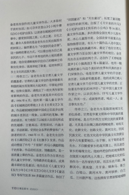 傳奇之二,金老先生是甘肅兒童文學(xué)的奠基者。甘肅的兒童文學(xué)創(chuàng)作是伴隨著共和國的誕生而發(fā)展壯大起來的,盡管起步較晚,但勢頭強(qiáng)勁,涌現(xiàn)出了一批優(yōu)秀作家和有影響的作品,金老先生就是其中的佼佼者。1956年6月,他的第一篇兒童文學(xué)作品《長城南邊的草地上》在《甘肅文藝》發(fā)表,作品敏銳捕捉到新中國成立后逐步出現(xiàn)的城鄉(xiāng)差別這一現(xiàn)象,以犀利的筆觸、鮮活的語言,有力批駁了以城里人自居而形成的優(yōu)越感,立意高遠(yuǎn),思想深刻,內(nèi)涵豐富,手法新穎,受到社會各界的贊譽和廣大讀者的好評。1960年11月,金老先生創(chuàng)作的《小滿歷險記》在《紅旗手》發(fā)表,作品成功塑造了外號“千里駒”的馬小滿聰明能干的形象,作品輕松活潑,情趣盎然,是一部質(zhì)量上乘的作品。金老先生作為甘肅杰出的兒童文學(xué)作家,寫得最多的是童話,成果最豐碩的也是童話。他先后在《兒童文學(xué)》《東方少年》《少年文藝》《幼兒文學(xué)》《童話報》等報刊發(fā)表300多篇童話作品,獨創(chuàng)了“田園童話”和“天生童話”,拓寬了童話題材創(chuàng)作的新天地,出版了《月牙泉的天馬》《小毛驢出國》《快樂的小公雞》等16部兒童文學(xué)作品集,多次獲得全國優(yōu)秀少兒圖書獎、冰心兒童圖書獎、全國農(nóng)家書屋重點出版物推薦目錄,有五六十篇作品入選中國兒童文學(xué)精選和典藏書庫,奠定了他在甘肅兒童文學(xué)界乃至全國兒童文學(xué)界的地位。金老先生在去世前的兩個月,還創(chuàng)作了《青蛙借雷聲》《小鎮(zhèn)典故》等6篇童話,他用一顆純真的童心與這個美好的世界和天真的孩子們深情告白。他是甘肅兒童文學(xué)的開創(chuàng)者、親歷者、實踐者和奠基者,他的成果已載入甘肅兒童文學(xué)乃至中國兒童文學(xué)的史冊,正如著名作家安武林評價:“在中國兒童文學(xué)作家之中,以農(nóng)民身份,抒寫兒童文學(xué)作品,終其一生,成就斐然者,唯此一人,金吉泰先生也。”