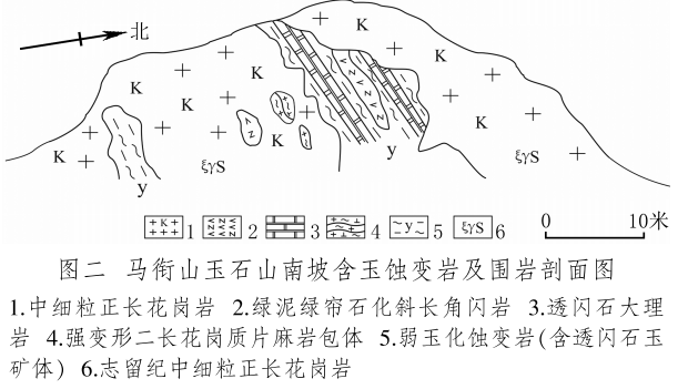 馬銜山玉礦分布在馬銜山東南部的玉石山(圖版一),海拔3028米。山上出露的地質(zhì)體主要為古元古界馬銜山巖群、中元古代片麻二長花崗質(zhì)巖[3]和志留紀(jì)正長花崗巖及正長巖。馬銜山巖群的巖性為黑云斜長片麻巖、變粒巖、斜長角閃巖和白云質(zhì)大理巖,巖石普遍遭受了韌性變形,變余糜稜巖發(fā)育。志留紀(jì)巖漿侵入期后熱液活動較強(qiáng),石英脈細(xì)脈發(fā)育,局部見螢石礦化或礦床[4]。玉礦化主要產(chǎn)于馬銜山巖群與志留紀(jì)正長花崗巖和正長巖接觸帶上(圖版二),具體賦存在與白云質(zhì)大理巖的接觸部位,是正長花崗巖及正長巖與鎂質(zhì)大理巖接觸交代蝕變的產(chǎn)物[5]?;◢弾r與片麻巖、變粒巖和斜長角閃巖接觸界線附近巖石雖有蝕變,但不見玉化蝕變巖或玉石出露。在近山頂開采玉石揭露的一個地質(zhì)剖面清晰地顯示了這些特征(圖二)。該剖面大致呈東西走向,長約50米,馬銜山巖群多呈殘留體出露,斜長角閃巖綠泥綠簾石化強(qiáng)烈,大理巖普遍發(fā)生蝕變,形成透輝透閃石大理巖,緊靠花崗巖接觸地帶發(fā)育窄窄的透閃石玉礦帶?,F(xiàn)在人們找玉,也主要在該剖面上的花崗巖和鎂質(zhì)大理巖的接觸帶上鑿洞,在接觸帶上見有多處采挖玉石的洞穴。在該剖面西側(cè)約50米,發(fā)育有正長巖與大理巖的混染帶,肉紅色正長巖中包裹混染著大量灰綠色透閃透輝大理巖,部分已蝕變?yōu)橥搁W透輝石巖,且質(zhì)地較細(xì)膩,成為半玉化巖石。剖面和周圍地質(zhì)特征表明,玉礦的形成是早古生代志留紀(jì)花崗質(zhì)雜巖體侵入到古元古代鎂質(zhì)大理巖,發(fā)生接觸交代蝕變作用的結(jié)果,在兩種巖石接觸帶形成玉礦體。但并不是蝕變帶中的巖石都是透閃石玉石,透閃石玉在蝕變帶中多呈雞窩狀或不規(guī)則狀分布,少量呈脈狀出露。從剖面及部分采坑的規(guī)模來看,玉礦體向深處有變大、變好的趨勢,這主要受控于接觸面產(chǎn)狀,在傾角較緩處礦體相對較大。橫向上在背離接觸面方向圍巖具有從透閃石玉到透閃透輝石玉、透閃透輝石大理巖再到含透閃石大理巖的變化特征,反映了交代蝕變強(qiáng)度與接觸帶溫度及熱液成分變化的密切關(guān)系。從玉礦體到蝕變圍巖由于成分和結(jié)構(gòu)的變化出現(xiàn)一系列不同類型的玉石或巖石。我們在剖面上采集到一些小塊的淡綠色玉料(圖版三)和出露較寬的微晶大理巖,經(jīng)偏光顯微鏡下薄片鑒定和XRF檢測,確定有透閃石玉、透輝透閃玉、透閃透輝石玉、透閃透輝石大理巖和含透閃石大理巖等,這與馬家窯遺址出土的齊家文化時期大部分玉質(zhì)品玉料類型基本一致[6]。部分地段近礦圍巖還有透輝石巖、透輝矽卡巖、矽卡巖化大理巖、蛇紋石化大理巖、斜長透輝石巖等。玉石山的采洞(坑)由于資源與環(huán)境保護(hù)的要求,大多已被填埋,但仍可見采坑殘留的位置。采洞(坑)均位于大理巖與正長花崗巖接觸帶靠近大理巖一側(cè),這也間接顯示了玉礦體的位置。此外,玉石山花崗巖中石英細(xì)脈較發(fā)育,局部可見螢石礦化,反映了花崗巖侵入期后低溫?zé)嵋夯顒尤暂^強(qiáng),對玉礦也有一定的改造影響。