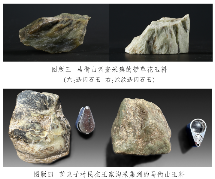 馬家窯遺址出土的齊家文化時期大部分玉質(zhì)品從外觀、礦物組成和微量元素特征上都與馬銜山玉料有極高的相似性,再加上馬家窯遺址距玉石山僅約60千米,是目前考古發(fā)現(xiàn)距離馬家窯遺址最近的玉礦山,因此馬家窯遺址出土的大部分玉質(zhì)品的原料來自馬銜山的可能性很大[28]。但從馬家窯遺址出土的部分玉邊角料所帶玉皮且都有一定的磨圓(圖版一〇)情況來看,馬家窯遺址出土的玉質(zhì)品玉料中可能有山流水或籽料。
