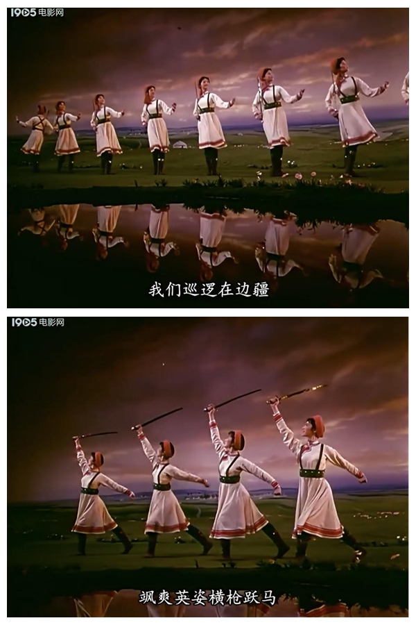 《草原女民兵》最初作為舞臺舞蹈,其美學(xué)特質(zhì)建立在現(xiàn)場性、即時(shí)性與三維空間性之上。而當(dāng)它通過《百花爭艷》的鏡頭被重新詮釋時(shí),經(jīng)歷了一場深刻的美學(xué)轉(zhuǎn)換。電影不僅記錄了這一舞蹈,更通過其特有的語言系統(tǒng),對舞蹈進(jìn)行了二次創(chuàng)作與美學(xué)升華。