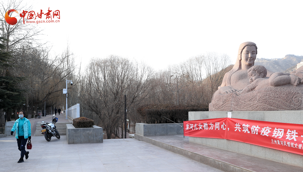 同樣,代表蘭州城市形象的黃河母親雕塑,也拉起了一條紅色橫幅,上面寫著“黃河兒女勠力同心,共筑防疫鋼鐵長(zhǎng)城。”