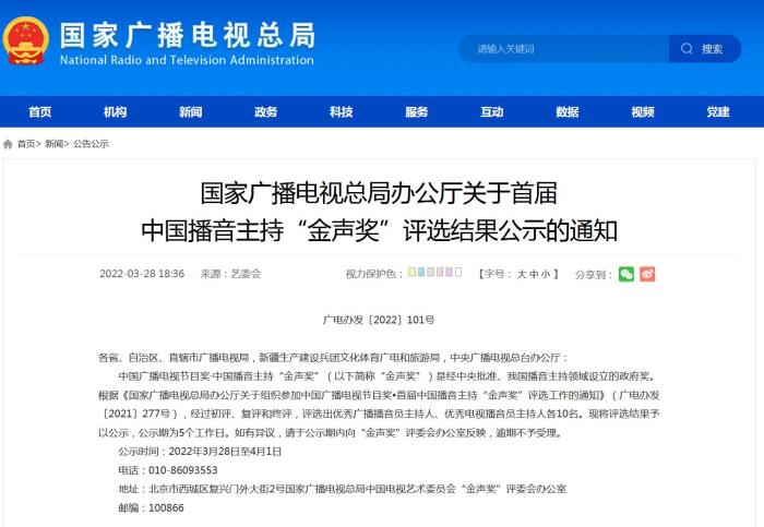 《通知》指出,根據(jù)《國家廣播電視總局辦公廳關于組織參加中國廣播電視節(jié)目獎•首屆中國播音主持“金聲獎”評選工作的通知》(廣電辦發(fā)〔2021〕277號),經(jīng)過初評、復評和終評,評選出優(yōu)秀廣播播音員主持人、優(yōu)秀電視播音員主持人各10名?,F(xiàn)將評選結果予以公示,公示期為5個工作日。
