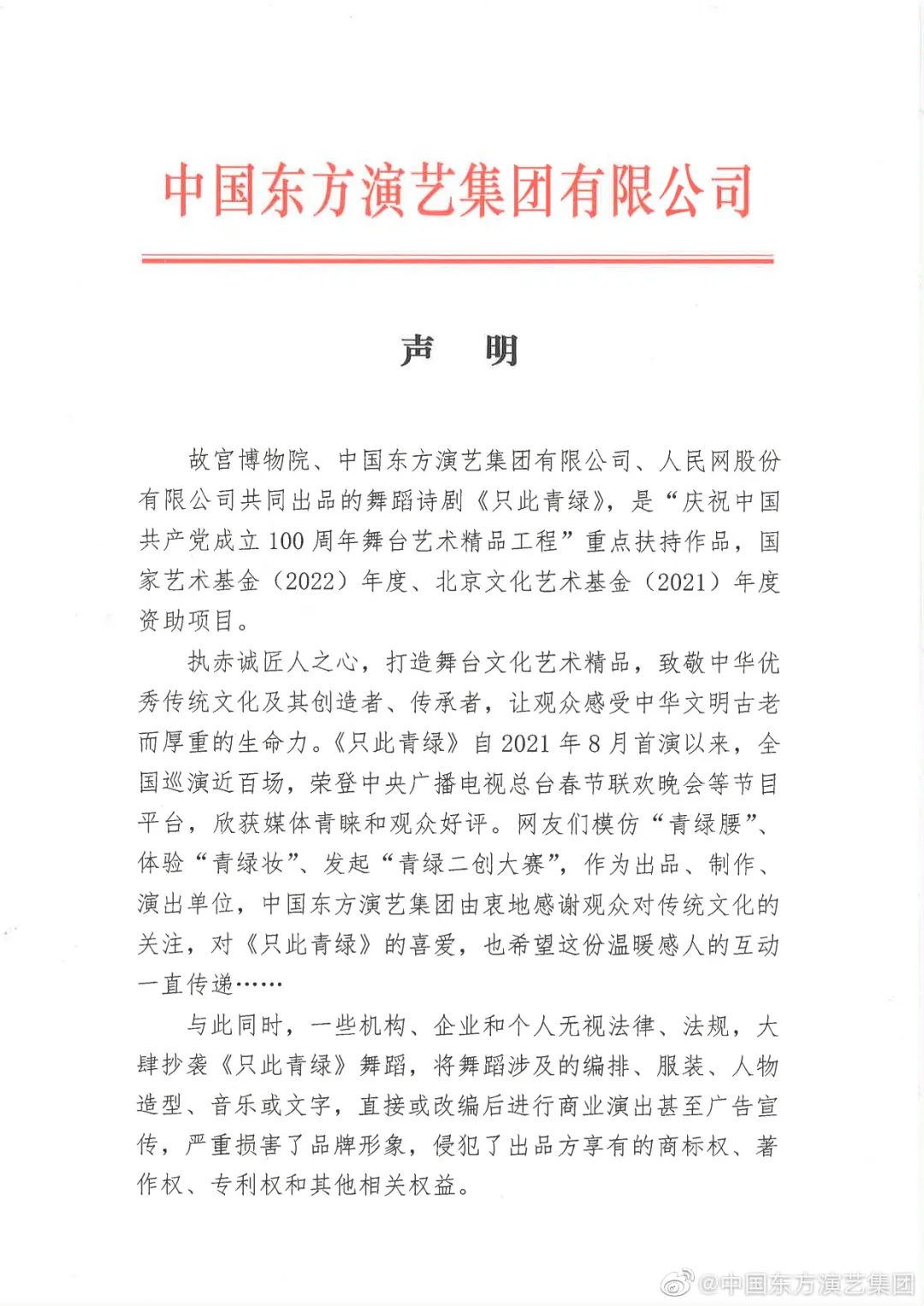 作為舞蹈詩劇《只此青綠》出品方之一,中國東方演藝集團25日發(fā)表聲明,已啟動對《只此青綠》的全面維權(quán)行動。