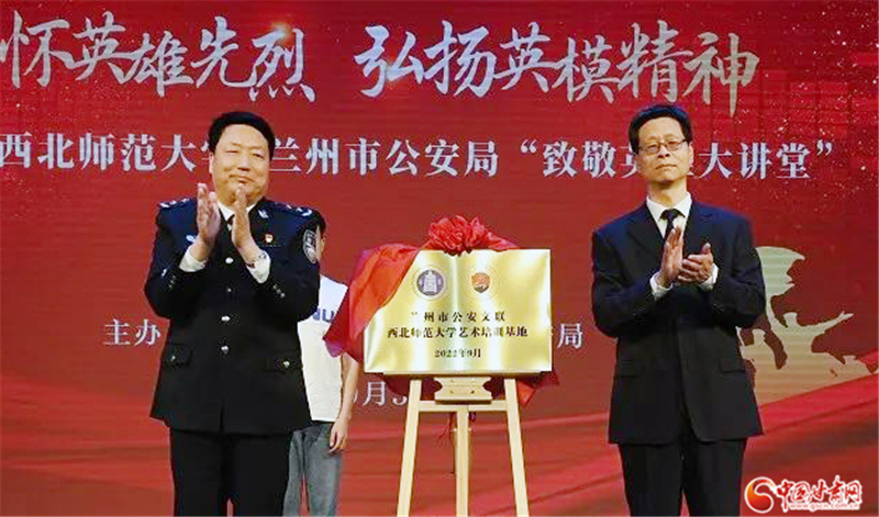 活動(dòng)中,王立朝代表蘭州市公安局,接受了劉仲奎代表西北師范大學(xué)捐贈(zèng)的8幅蘭州公安烈士畫像,向?qū)W校頒發(fā)收藏證書,并一同為“蘭州公安文聯(lián)西北師范大學(xué)藝術(shù)培訓(xùn)基地”揭牌。蘭州公安竇勇烈士之子竇永杰、李鋼烈士之子李俊杰分別追憶父親的英雄事跡。“全國優(yōu)秀人民警察”、城關(guān)分局直屬大隊(duì)大隊(duì)長張子劍,“全國公安機(jī)關(guān)愛民模范集體”代表、市局刑警支隊(duì)電信網(wǎng)絡(luò)案件偵查大隊(duì)民警陳薈文分別作分享報(bào)告。學(xué)校師生和市公安局民輔警代表共同演繹詩朗誦《是誰》、合唱《少年壯志不言愁》,以多種形式緬懷英烈,致敬英雄。