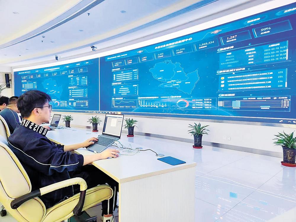 蘭州市社會(huì)治安綜合治理中心工作人員實(shí)時(shí)關(guān)注“民情地圖·小蘭善治”平臺(tái)。