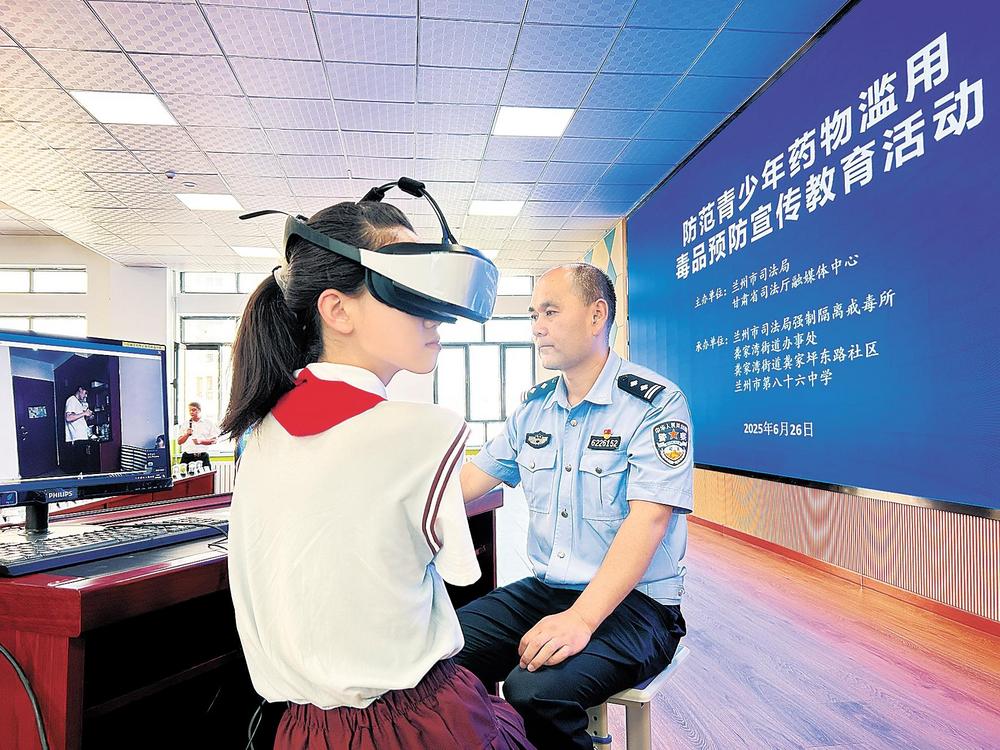 2025年6月26日,蘭州市司法局強(qiáng)制隔離戒毒所干警走進(jìn)蘭州市第八十六中學(xué)開展禁毒宣傳教育。圖為學(xué)生佩戴VR眼鏡,通過虛擬現(xiàn)實(shí)技術(shù)創(chuàng)造逼真的沾染毒品場景,讓學(xué)生身臨其境地感受毒品的危害。
