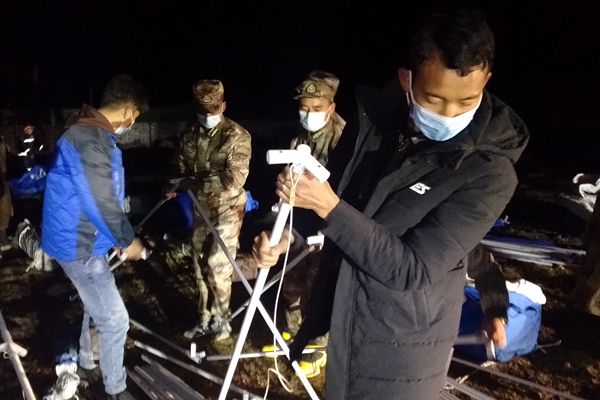 4月1日當(dāng)晚,長須貢瑪鄉(xiāng)紀委干部跟隨救援隊深入震中江瑪村等地開展災(zāi)情摸排和群眾救助工作,確保各類救災(zāi)物資及時發(fā)放到位。圖為長須貢瑪鄉(xiāng)紀檢監(jiān)察干部在受災(zāi)群眾臨時安置點參與救災(zāi)帳篷搭建工作。