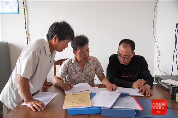廣西壯族自治區(qū)鹿寨縣鹿寨鎮(zhèn)波井村村務(wù)監(jiān)督委員會(huì)成員定期對村級黨務(wù)、村務(wù)、財(cái)務(wù)公開情況及三重一大重要事項(xiàng)的決策等進(jìn)行監(jiān)督檢查,確保村級事項(xiàng)決策公平、公開透明。(廣西壯族自治區(qū)柳州市鹿寨縣紀(jì)委監(jiān)委 韋娟 攝)