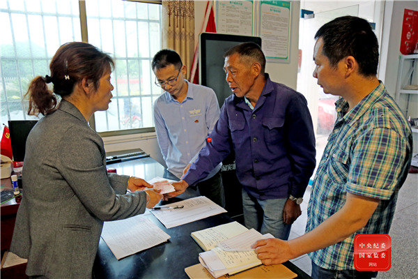 湖南省益陽市資陽區(qū)長春鎮(zhèn)幸福村村級義務(wù)監(jiān)督員主動(dòng)履職,全程參與并監(jiān)督發(fā)放產(chǎn)業(yè)扶貧分紅資金,確保每一筆民生資金落到實(shí)處。(湖南省益陽市資陽區(qū)紀(jì)委監(jiān)委 張偉敏 攝)