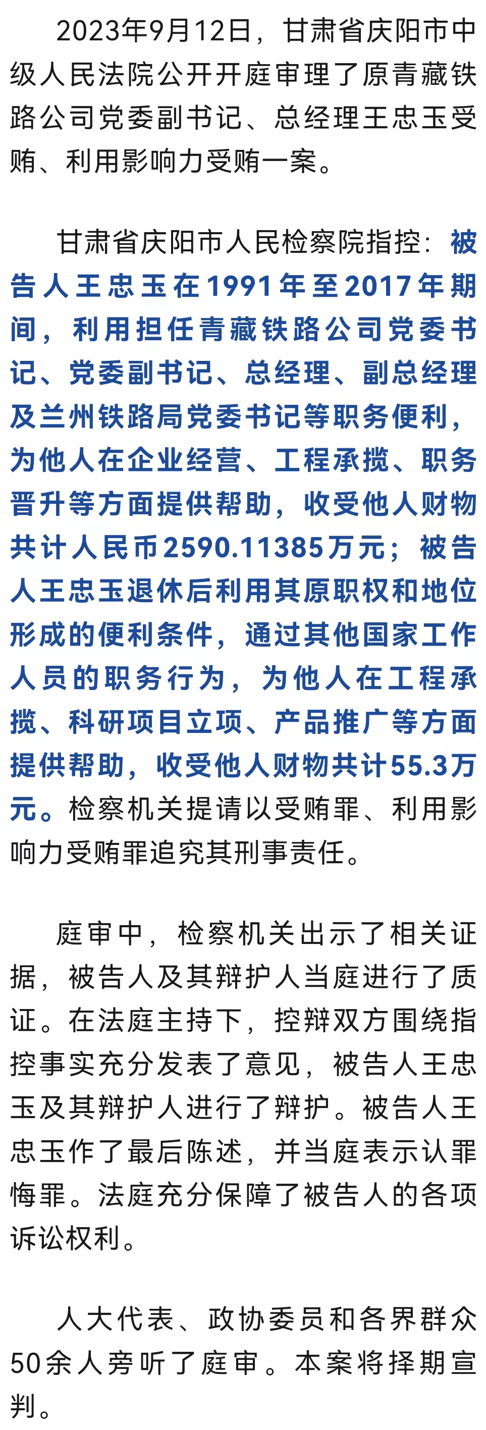 原標題:《原青藏鐵路公司黨委副書記、總經(jīng)理王忠玉受賄、利用影響力受賄案一審開庭》