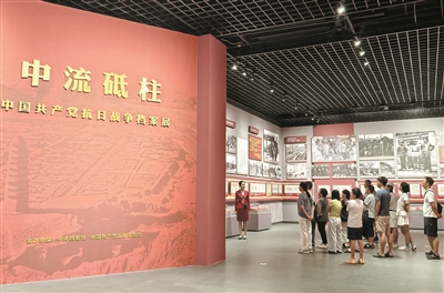 走進(jìn)中國共產(chǎn)黨歷史展覽館四層專題展廳,首先看到一面紅底金字的大型展板,形似一本翻開的書本。“書”的正面,“中流砥柱”四個大字在燈光照射下閃閃發(fā)亮,下方緊跟一行小字“中國共產(chǎn)黨抗日戰(zhàn)爭檔案展”;側(cè)面,金色字體展示著毛澤東同志《中國共產(chǎn)黨在民族戰(zhàn)爭中的地位》里的內(nèi)容:“每一個共產(chǎn)黨員必須發(fā)揮其全部的積極性,英勇堅決地走上民族解放戰(zhàn)爭的戰(zhàn)場,拿槍口瞄準(zhǔn)日本侵略者。”