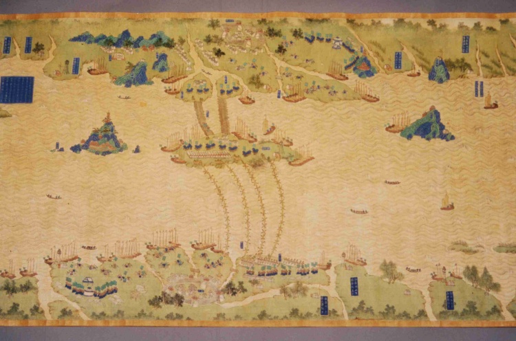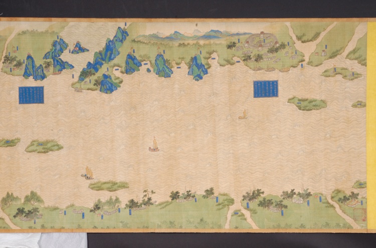 清代,縱59.7厘米,橫1340厘米。采用傳統(tǒng)技法繪制,上南下北,凡江水、港泊、洲渚、城池、村落、林木、山石、舟車(chē)、人物、旗幡、軍械均以立體形象呈現(xiàn),飾以石青、石綠等多種顏色。上起九江、下至鎮(zhèn)江,千里區(qū)域中列攔江纜、攔江牌、戰(zhàn)船、木樓、煙墩、駐軍地、營(yíng)等各種軍事設(shè)施,每營(yíng)均有金書(shū)大榜題,記述本營(yíng)所處位置及兵力布置狀況,每汛的標(biāo)題上還記有汛與汛之間的里數(shù)。