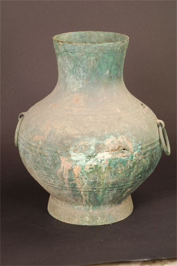 漢代,武威雷臺漢墓出土。高44.2厘米,口徑18.1厘米,底徑21.9厘米。直口,圓腹,假圈足,腹部有三組瓦紋和對稱的兩個獸面銜環(huán)輔首,腹上部篆書“巨李鍾”三字。李,姓氏?!墩f文•金部》:“鐘,酒器也。從金,重聲。”