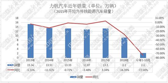 2006年,力帆推出首款轎車力帆520,新車不足5萬元的售價(jià)在當(dāng)時(shí)引發(fā)關(guān)注,月銷量一度達(dá)到5000輛。2013年,力帆年銷售汽車15.34萬輛,成為汽車界的一匹黑馬。然而,好景不長(zhǎng)。自2016年開始,力帆汽車進(jìn)入下行趨勢(shì),目前更是步履維艱。力帆產(chǎn)銷快報(bào)顯示,2019年1-10月,力帆傳統(tǒng)乘用車?yán)塾?jì)銷售2.2萬輛,同比下滑73.5%,10月僅銷售29輛;新能源累計(jì)銷售2458輛,同比下降65.42%,10月僅銷售423輛。