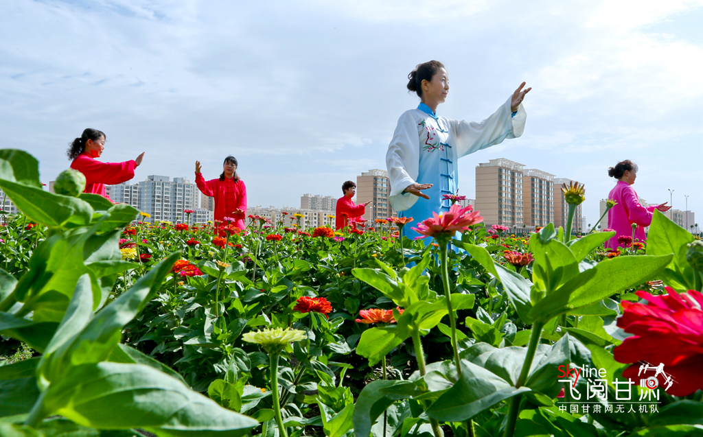 7月8日清晨,甘肅張掖甘州區(qū)順祥名苑小區(qū)南側(cè)的123畝裸露土地綠化美化點(diǎn)上,各種鮮花競(jìng)相綻放,花香四溢,綠意盎然,太極拳練習(xí)愛(ài)好者正在練習(xí)太極拳。
