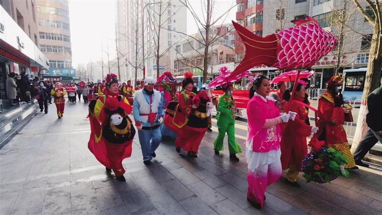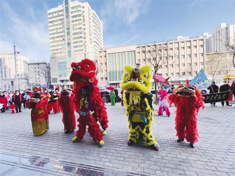 社區(qū)工作人員、舞獅隊、社火隊和大鼓隊為轄區(qū)居民帶來了扭秧歌、舞獅、敲大鼓、大頭娃娃和劃旱船等表演。