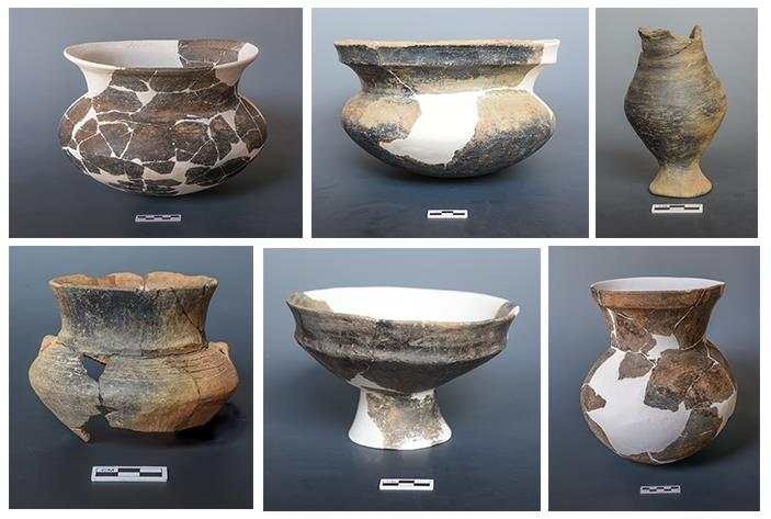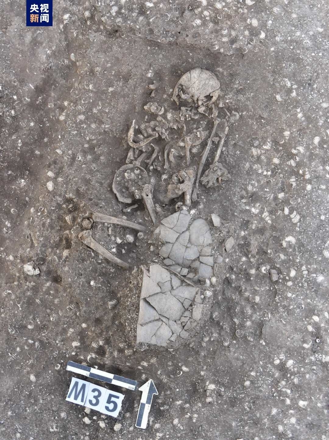 古城村遺址面積約4.2萬平方米,現(xiàn)存的貝丘堆積最厚處達(dá)6.5米,由大量尾部被敲破的螺螄殼與灰土層交替堆疊形成。碳十四測定年代為距今3600至2500年,約相當(dāng)于中原地區(qū)的商代至兩周時(shí)期。商代遺存可分為早晚兩段,早段發(fā)現(xiàn)保存完整的橢圓形環(huán)壕聚落,由中心臺(tái)地、外圍環(huán)壕和護(hù)坡組成,中心臺(tái)地面積約27000平方米,環(huán)壕和護(hù)坡周長約600米,這種聚落格局一直延續(xù)至兩周時(shí)期。商代晚段發(fā)現(xiàn)一批土坑墓和甕棺葬。兩周時(shí)期的遺存以房址、螺殼堆、灰燼、活動(dòng)面等居住類遺跡為主,房址多為方形半地穴式。出土青銅器、陶器、玉器、石器、骨器、木器等文物4000余件。