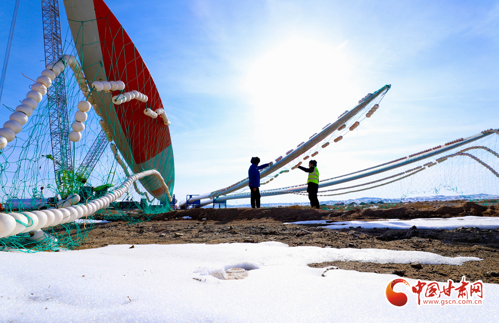 2月21日,張掖市臨澤縣平川北灘30萬千瓦風(fēng)電項目建設(shè)現(xiàn)場,工作人員正在進(jìn)行風(fēng)葉吊裝前檢查。