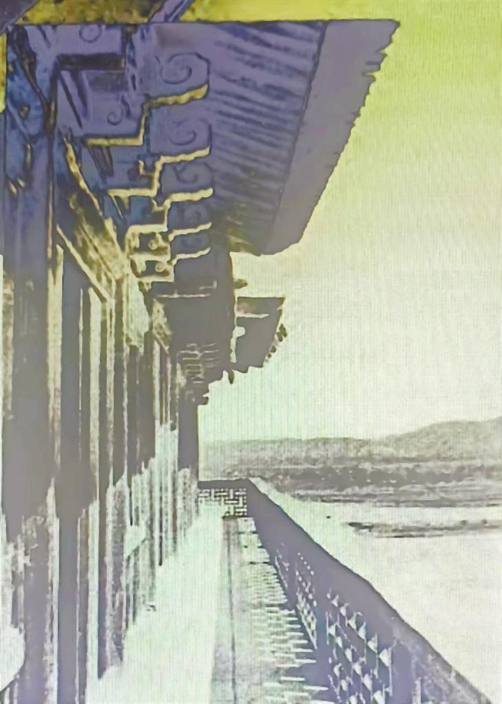 林競(jìng)《西北叢編》一書載,其與蘭州友人于1919年2月7日出游雷壇河臥橋,“橋長(zhǎng)十余丈,其形如弓,橋上蓋屋,足蔽風(fēng)雨,五彩繪畫,兩端有坊,東曰‘空中鰲背’,西曰‘天上慈航’,橋底無(wú)墩,自遠(yuǎn)望之,宛如臥龍。”林競(jìng)還詳細(xì)記錄了蘭州雷壇河臥橋的建造方法,并對(duì)之科學(xué)性表示肯定:“聞此橋原來(lái)有墩,因某年山洪爆發(fā),被其沖毀,自是始改今式。其法,先將兩岸之橋基筑好,以數(shù)丈長(zhǎng)之巨木直列成排,復(fù)以橫木連之,木材之?dāng)?shù),依橋之寬狹而定,其前端伸出橋中約二三尺,其后端即以巨石壓之,如是疊架不已,每加一層,即前端伸過(guò)下層數(shù)尺,如倒掛之階梯然。而層與層之間,復(fù)聯(lián)以鐵環(huán)及釘木,迨兩岸相距不遠(yuǎn)時(shí),即以巨木渡之。此種構(gòu)造,在西北往往因河水湍急,不能筑墩,或游牧之民,不知在河中建筑橋墩之法而始用之。然亦甚合於力學(xué)原理,未可忽視也。”