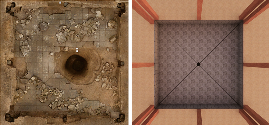 中部夯土臺基的中心發(fā)現(xiàn)一處神秘的半地穴空間。它的地面鋪素磚,四壁貼壁磚并用鐵釘固定,各磚縫之間還用特殊材料專門做了“美縫”處理。種種跡象表明此處可能是一個“水池”,但中間被一口豎井狀大坑破壞。