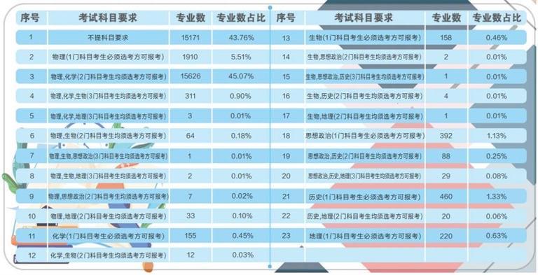 據(jù)了解,根據(jù)《甘肅省深化高等學(xué)??荚囌猩C合改革實施方案》要求,從 2021年秋季入學(xué)的普通高中一年級學(xué)生開始,實行基于統(tǒng)一高考和高中學(xué)業(yè)水平考試成績、參考綜合素質(zhì)評價的高校考試招生模式。到2024年,基本形成分類考試、綜合評價、多元錄取的高??荚囌猩贫?,健全促進公平、科學(xué)選才、監(jiān)督有力的高??荚囌猩w制機制。此次在我省報送選考科目要求的高校專業(yè)共計64092條,其中本科專業(yè)34670條。專業(yè)選考科目要求共有23種組合,其中不提科目要求的本科專業(yè)數(shù)量占本科專業(yè)總數(shù)的43.76%,含物理科目的占比為51.79%,含化學(xué)科目的占比為46.46%,含歷史科目的占比為1.74%,含“物理+化學(xué)”科目的占比為45.98%。