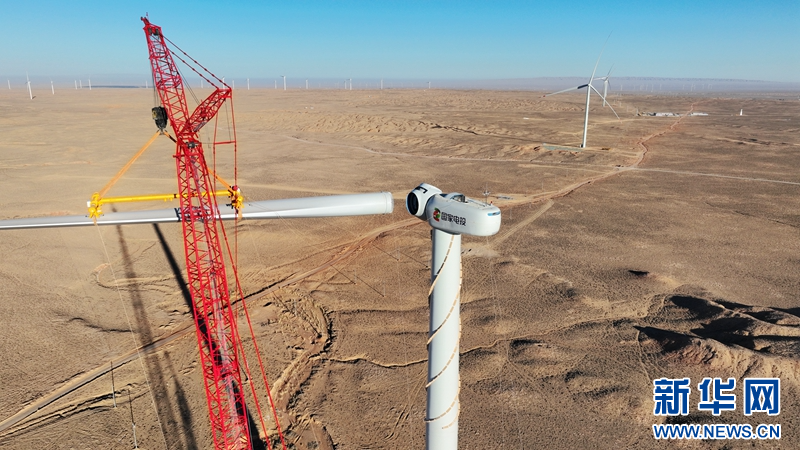 隆冬季節(jié),在甘肅省張掖市甘州區(qū)平山湖風(fēng)電基地國家電投10萬千瓦風(fēng)電項目建設(shè)工地,工人正在進(jìn)行風(fēng)機(jī)葉片吊裝作業(yè)。