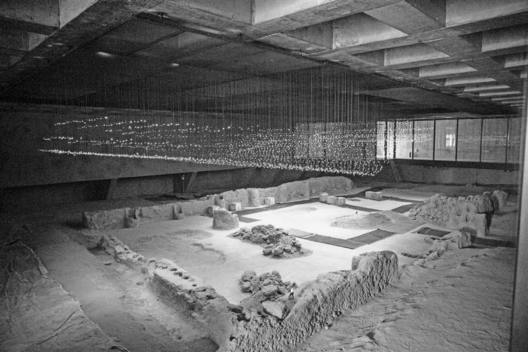 在遺址的半山中心位置有一座微微隆起的現(xiàn)代建筑,下面是被保護的大型宮殿式建筑——F901,該建筑屬于第四期文化,即仰韶晚期,約距今5000年,是目前所見我國新石器時代面積最大、工藝水平最高的房屋建筑。F901以長方形主室為中心,主室面積131平方米,東西中軸線長16米、南北中軸線寬8米。兩側(cè)擴展為與主室相通的東西側(cè)室,左右對稱;主室后面設(shè)單獨的后室,前面有附屬建筑,前后呼應(yīng)、主次分明,形成一個結(jié)構(gòu)復(fù)雜、布局嚴謹、占地總面積達420多平方米的建筑群體。其居住面大部分保存完好,以輕骨料、砂石、料姜石粉混凝而成的類似現(xiàn)代水泥地面,光潔而堅硬,它是大地灣乃至清水河沿岸的原始部落的公共活動中心——一座宏偉而莊嚴的部落會堂。