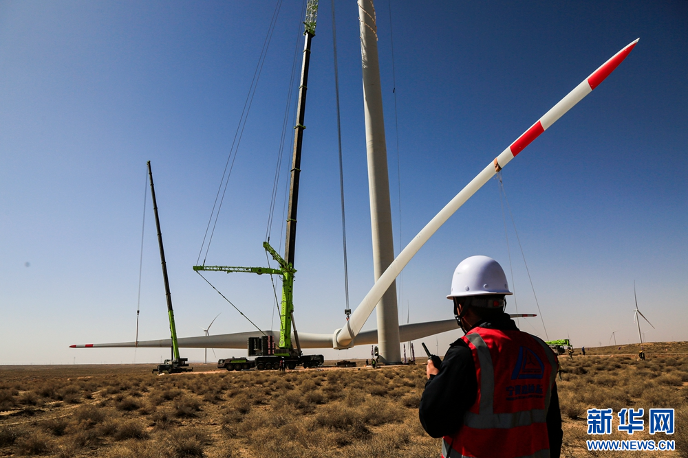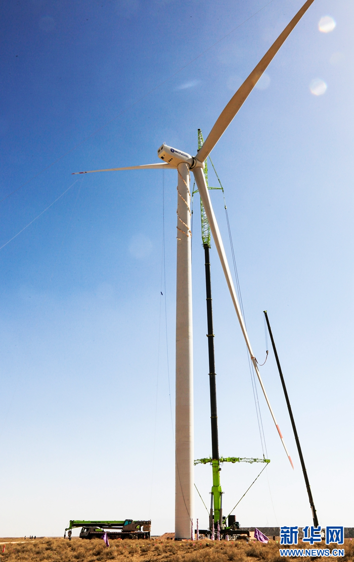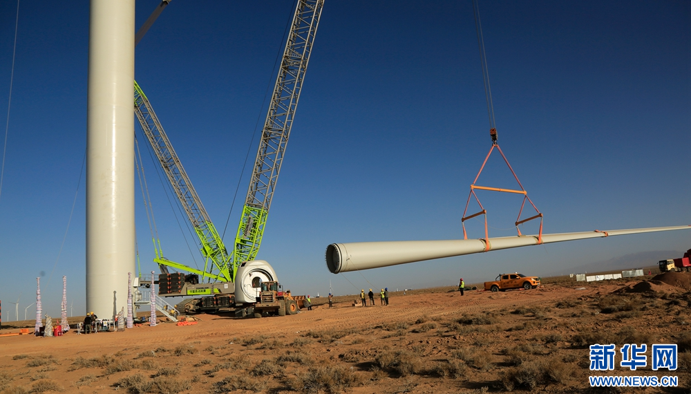 近日,在甘肅省張掖市甘州區(qū)平山湖20千瓦風(fēng)電施工現(xiàn)場,工人們緊張有序地進行風(fēng)電設(shè)備安裝工作。新華網(wǎng)發(fā)(陳禮 攝)