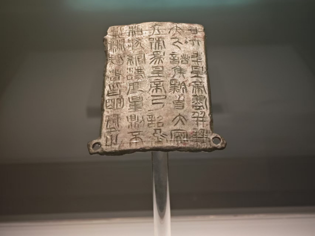 “鎮(zhèn)原縣博物館的鎮(zhèn)館之寶是秦二十六年銅詔版,1976年 4月 1日被鎮(zhèn)原縣城關(guān)鎮(zhèn)富坪村建宅取土的農(nóng)民發(fā)現(xiàn)并上交。在1996年 9月,國家文物局鑒定專家組定為國家一級文物。這塊銅詔版上有文字5 行,共40字,字跡清晰,線條纖細(xì),字體為小篆。在用筆結(jié)構(gòu)上既有秦代小篆規(guī)矩整飭的風(fēng)范,又保留著大篆文字的某些特點(diǎn)。”鎮(zhèn)遠(yuǎn)縣博物館講解員介紹道。