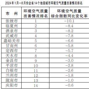 甘肅省生態(tài)環(huán)境廳發(fā)布2024年1月—8月份全省14個地級城市環(huán)境空氣質量排名情況