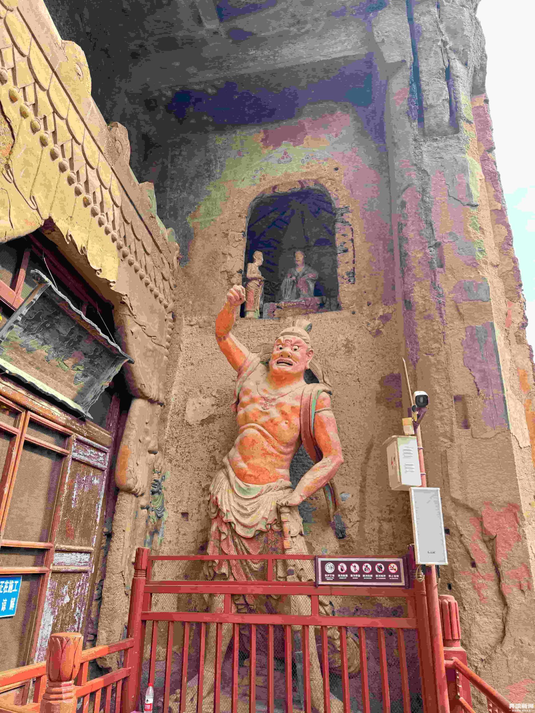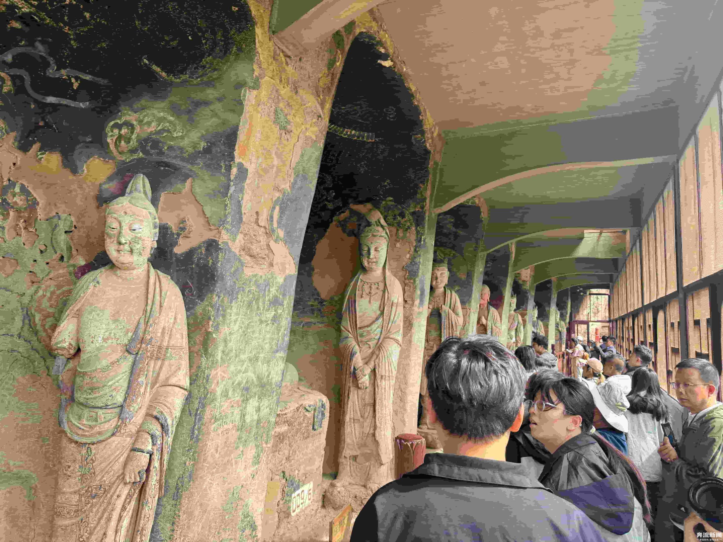 窟內(nèi)佛像造型各異,色彩鮮艷,既有莊嚴(yán)肅穆的佛祖、菩薩,也有生動(dòng)活潑的弟子、天王。這些造像中,雖然有石雕和個(gè)別的木雕,但主要以泥塑為主,體現(xiàn)了多朝代中國(guó)佛教泥塑造像藝術(shù)的發(fā)展演變規(guī)律。奔流新聞?dòng)浾吡私獾?,在技法上,工匠們運(yùn)用了圓雕、浮雕、鏤雕等多種技藝,使得佛像栩栩如生,富有強(qiáng)烈的立體感和動(dòng)感。麥積山石窟也因?yàn)槠洫?dú)特的“東方微笑”與精美的泥塑藝術(shù)聞名于世,被譽(yù)為“東方雕塑陳列館”。