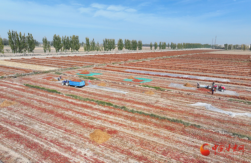 “我們種植的辣椒品種主要是朝天椒,成熟后需要先割倒擺放在壟溝上晾曬,一方面是辣椒干透后機械脫粒,另一方面也是為了防霜凍。這些朝天椒都是訂單辣椒,等過幾天曬好后由企業(yè)統(tǒng)一收購,直接運走,每畝產(chǎn)量500公斤左右,每畝收益能達到5000元以上。”種植大戶韓克紅說。