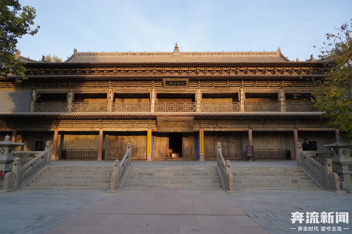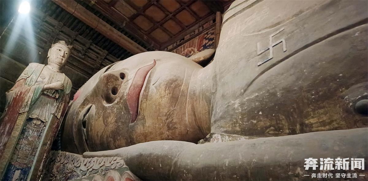 大佛殿正中,臥佛安然酣睡,佛身長35米,肩寬7.5米。造像木胎泥塑,金妝彩繪,頭枕蓮臺,面西而臥。雙眼半閉,嘴唇微啟,姿態(tài)安詳。臥佛首足處塑大梵天、帝釋天立像,身后為十大弟子舉哀像,南北兩側塑十八羅漢群像,造型精美,栩栩如生。殿身兩層樓閣,青瓦飛檐、朱柱環(huán)立,殿門兩側有佛經(jīng)變故事磚雕,四周墻面及上層板壁繪明清時期諸天禮佛、山海經(jīng)故事、西游記故事及佛經(jīng)變故事壁畫,面積約530平方米。