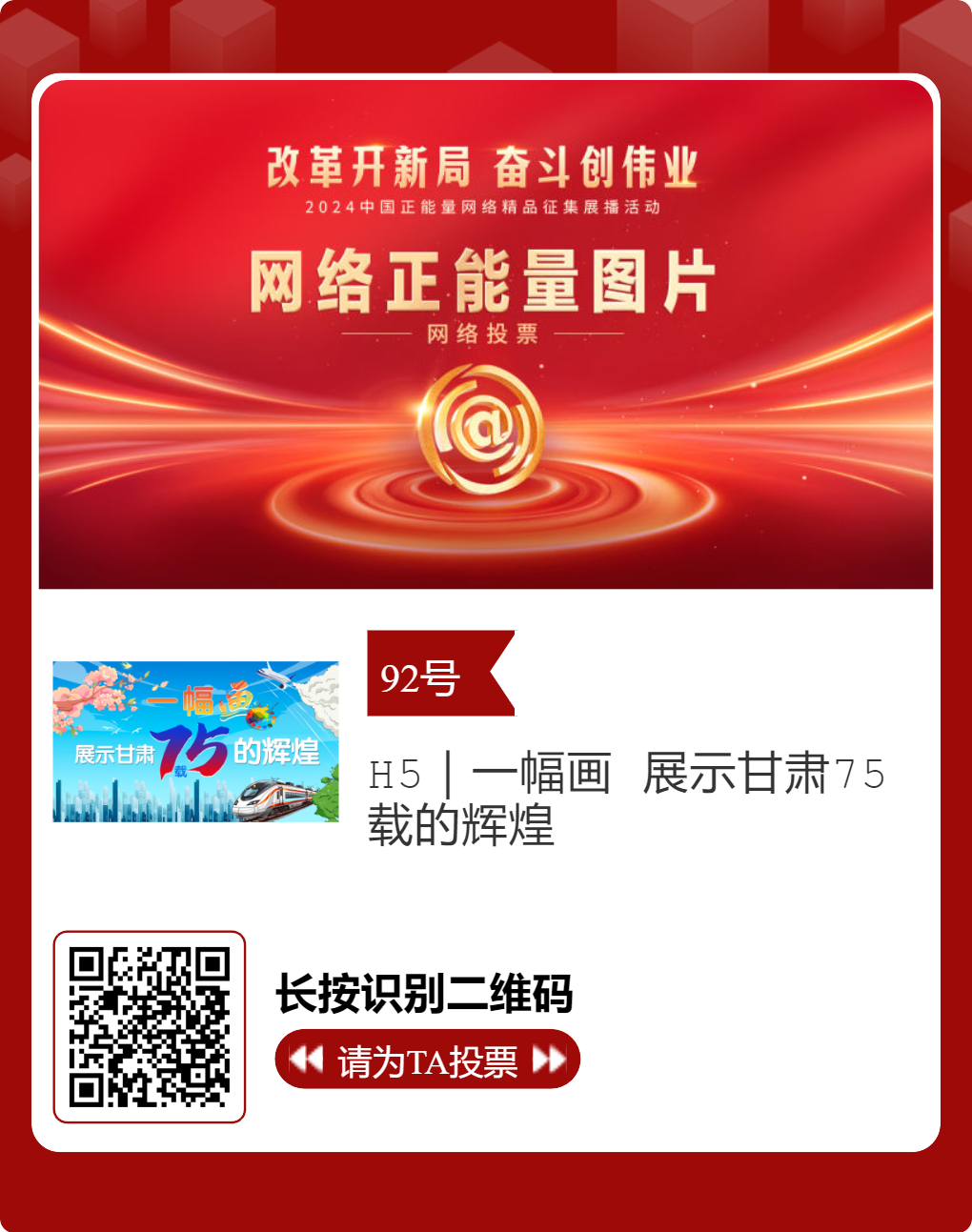 經(jīng)過(guò)初選,由甘肅省委網(wǎng)信辦和白銀市委網(wǎng)信辦選送的3件作品脫穎而出,進(jìn)入終選。在此,誠(chéng)邀每個(gè)充滿正能量的你,為優(yōu)秀作品投票點(diǎn)贊,為甘肅正能量發(fā)聲。