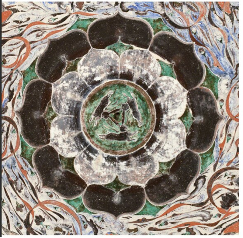 踏入窟內(nèi),仰頭凝望,藻井中央那朵八瓣蓮花宛如夜空中綻放的星辰,花瓣層層疊疊,細(xì)膩而生動(dòng)。蓮花中央,是獨(dú)具匠心的三兔連耳圖案。