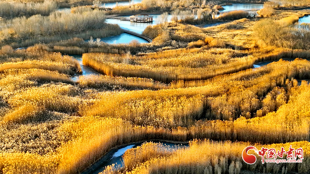 12月4日,張掖市黑河濕地國家級自然保護區(qū)內(nèi),經(jīng)風(fēng)霜浸染的蘆葦與蒲草披上金裝。從高空俯瞰,夕陽下的蘆葦蕩如金色海洋,蘆花隨風(fēng)輕舞,碧水凝冰環(huán)繞其間,宛如一幅鋪展的濕地金畫卷,吸引眾多游客與攝影愛好者前來觀賞拍攝。