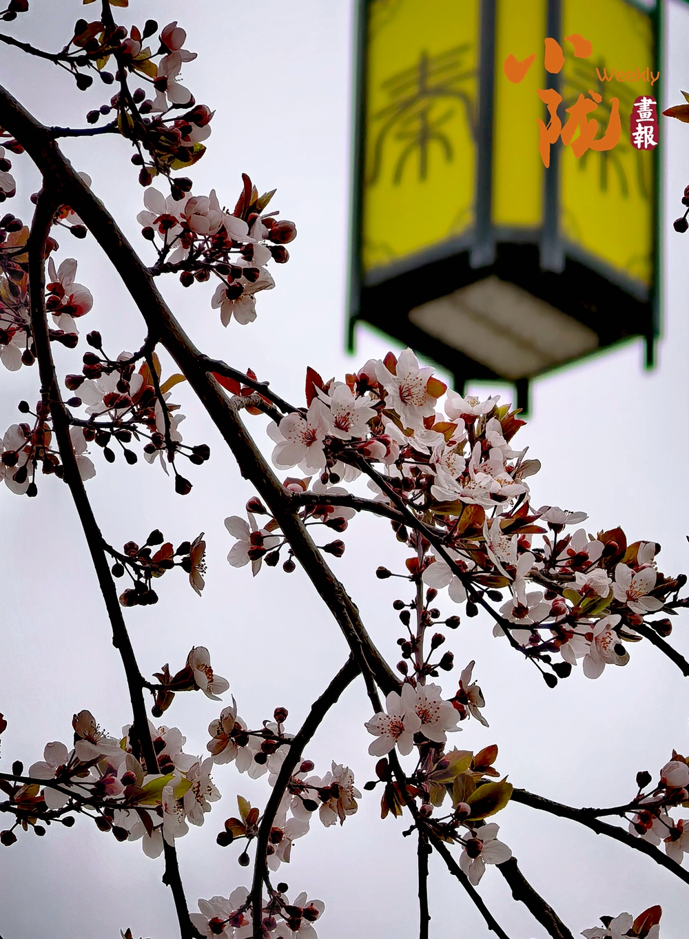 紫葉李花開(kāi)滿枝,白中帶粉的花瓣簇?fù)碓谥︻^,搭配著深褐枝椏與古色古香的街燈,將春日的柔美與街巷的煙火氣悄然融合,盡顯別樣的春日情韻。