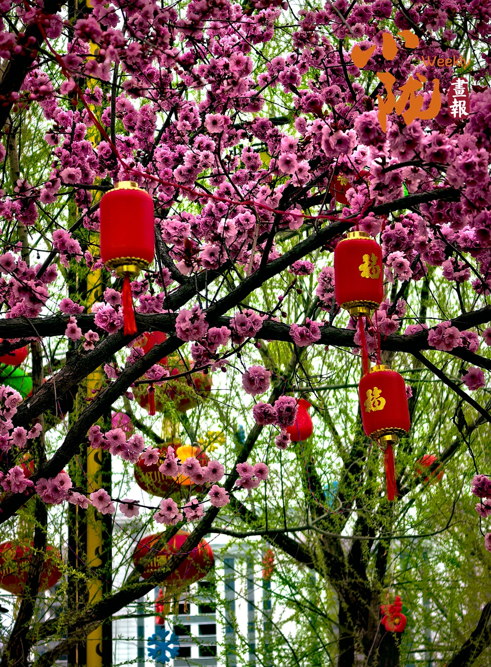 紅梅綴滿枝頭,粉艷的花朵在枝椏間次第舒展,搭配著街頭懸掛的紅燈籠,將春日的爛漫與熱鬧的煙火氣交織,暈染出鮮活又喜慶的春日氛圍。