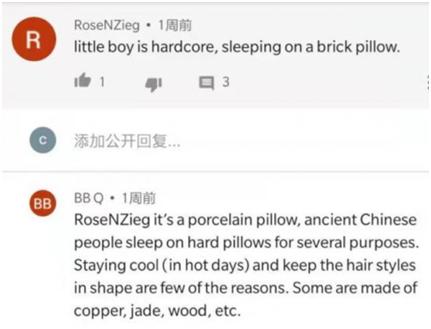 RoseNZieg留言:“這是個硬核男孩兒,睡在石頭枕頭上。”BBQ回復(fù)樓主:“這個枕頭是瓷器,中國古人都睡在這種硬枕頭上,還有一些是銅、玉、木頭做的。睡這種枕頭,不冬暖,但夏涼,還能保持飄逸的發(fā)型”