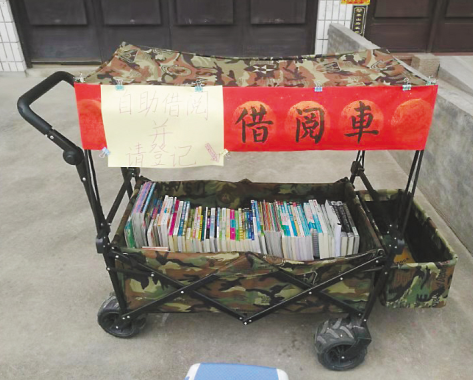 早上9點(diǎn)左右,自助借閱車從外婆家推出門,天黑了再推回來(lái)。看到想讀的書,讀者自行登記書名和個(gè)人信息,留下聯(lián)系方式,就能把書借回家。